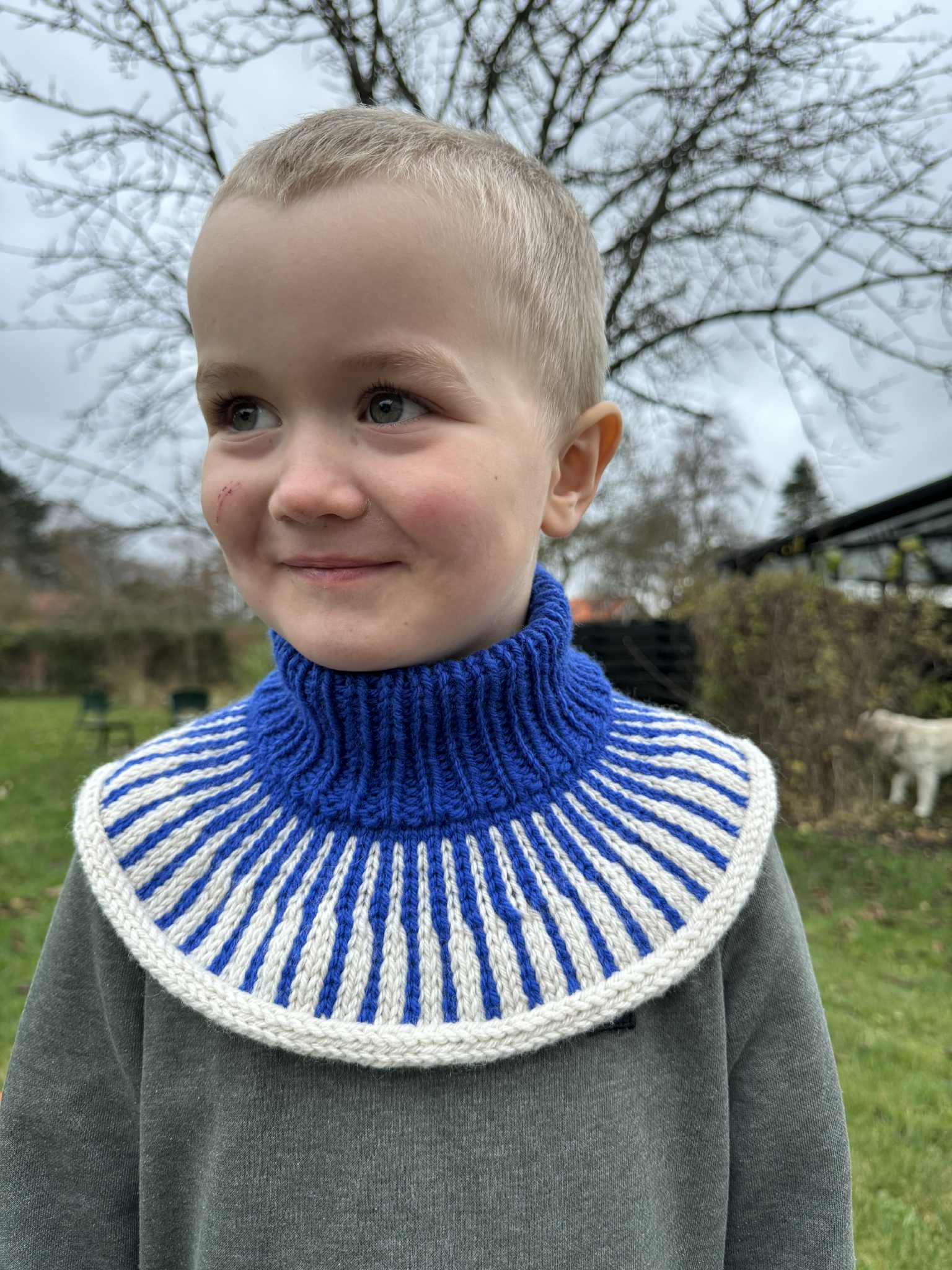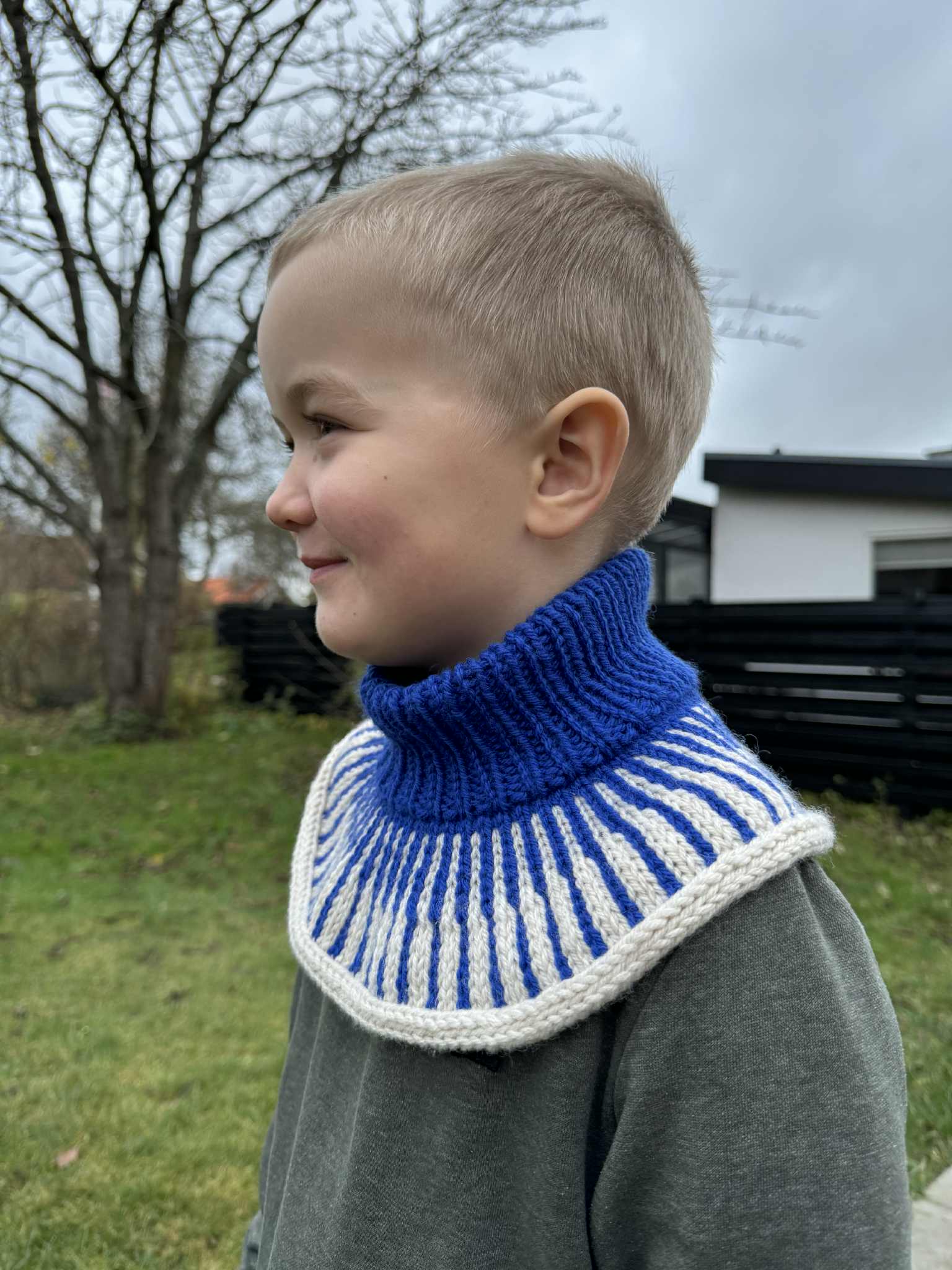 Okapi Neck Junior strikkes oppefra og har ombukket halsrib. Der tages ud i